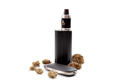 CBD and THC vaping products, dry herb vaporizer and healthy inhaling of cannabis concept theme with e cigarette and vape mod surrounded by marijuana buds isolated on white background[/caption]