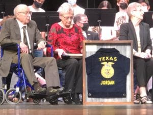 In a touching gesture, the district presented 95-year-old Melvin Jordan, the last surviving child of Hank and Olga Jordan, an FFA jacket with “Jordan” on the back. Beverlye Jordan Shafer, Melvin Jordan’s oldest daughter, sat next to Melvin when Crowell presented the jacket. She said the gesture brought her father to tears.