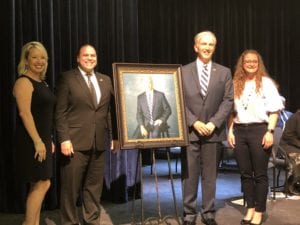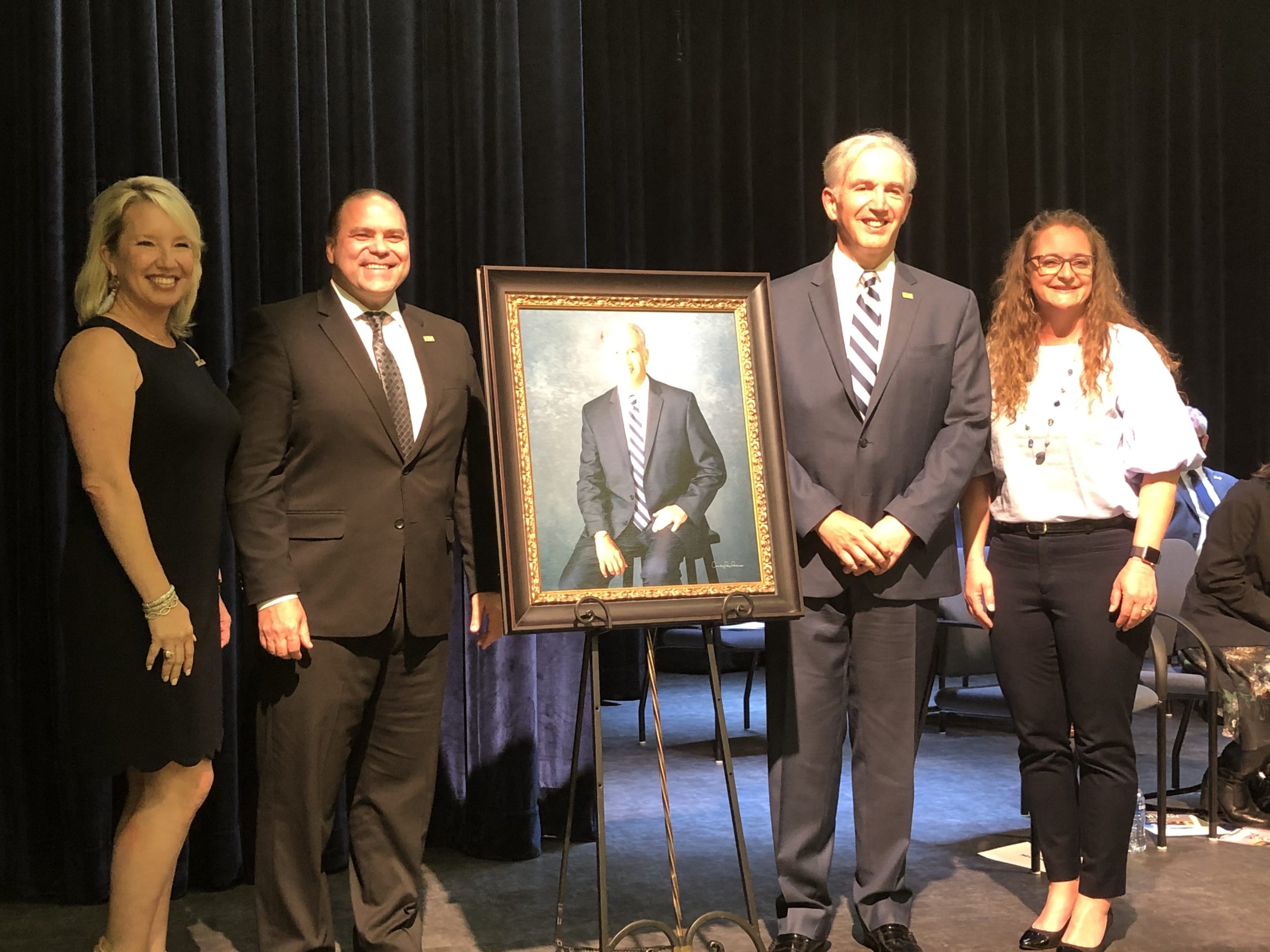 Peter McElwain, third from left, poses with his namesake portrait at the McElwain Elementary School dedication. Pictured with McElwain are, from left, Ashley Vann, school board president; Dr. Ken Gregorski, superintendent; and Euberta Lucas, principal (George Slaughter photo)[/caption]