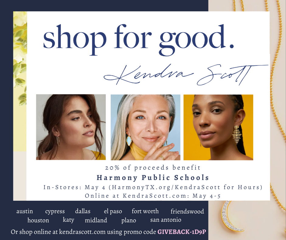 To participate in the "Shop for Good" event, shoppers can visit one of 18 Kendra Scott locations statewide Tuesday, May 4 during specified store hours to have 20 percent of their purchase donated directly to Harmony. (For store hours and times, visit www.HarmonyTX.org/KendraScott.)