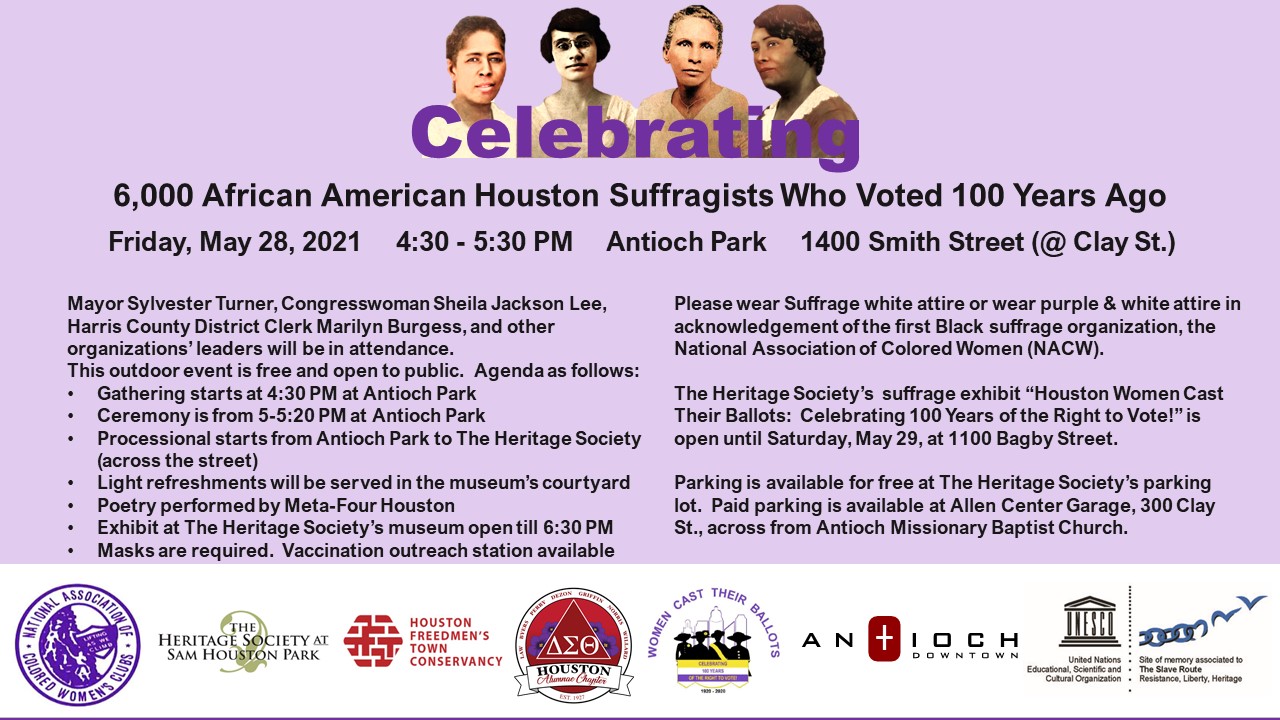 On Friday, May 28, the National Association of Colored Women (NACW), Houston Freedmen’s Town Conservancy, Antioch Missionary Baptist Church, Delta Sigma Theta Sorority, Inc. Houston Alumnae Chapter, and The Heritage Society, will gather at 4:30 PM, at Antioch Park, 1400 Smith St., to honor the impressive turnout of African American suffragists who voted on November 2, 1920. Special guest speakers include Congresswoman Sheila Jackson Lee, Mayor Sylvester Turner, and Harris County District Clerk Marilyn Burgess. “The Houston Suffragists Project uncovered the story of how Houston women went to court challenging the Texas Constitution’s Jim Crow poll tax,” The Heritage Society’s executive director, Alison Bell said. “The suffragists’ victory resulted in an outpouring of 6,000 African American women and 8,000 white women voting in the first federal election after the ratification of the 19th Amendment.” “Three African American women were on the ballot in 1920, and on Sundays in the Black churches, women taught each other how to vote,” the Houston Suffragists Project member, Rae Bryant said. “The Antioch Church women are a big part of this amazing civil rights story.” Bryant is also a volunteer curator for The Heritage Society’s suffrage exhibit “Houston Women Cast Their Ballots: Celebrating 100 Years of the Right to Vote!”. “With our church located in the center of Freedman’s Town, we served as an integral community center in 1920,” Pastor Lou McElroy of Antioch Missionary Baptist Church said. “As the first African American church in Houston that was built and owned by former slaves in 1866, many of those members were still alive and put their lives on the line in the fight for women’s rights. It is in that same historic spirit in 1920 that we continue to advocate for women’s rights,” Pastor McElroy added.   “This unique suffragist story of Harris County Women from nearly 101 years ago gives us encouragement to continue fighting for our right to vote under challenging circumstances, which women and minorities once again face in Texas and throughout the country,” The Heritage Society’s board member Martha Whiting-Goddard said. “We are excited to recognize the past accomplishments of local women in Harris County and Texas, which provide us with the hope and determination to see our voting rights battles through, both now and in the future.” During the free event, the organizations will celebrate the same spirit of joy and commitment as suffragists who persisted to gain the right to vote. Attendees are encouraged to wear ‘suffragist white’ dresses or purple and white attire to honor the NACW, the original African American women’s suffragists’ organization. Masks are required for the event, and a vaccination station inside the church is available. Following a celebratory speech at Antioch Park, attendees will process/walk from the church to The Heritage Society. All are invited to enjoy special performances by the Meta-Four Houston Poetry Slam Team, light refreshments in the museum’s courtyard, and open tours of the suffrage exhibit at The Heritage Society’s museum until 6:30 PM. More about the Exhibit: The Heritage Society’s current exhibit “Houston Women Cast Their Ballots: Celebrating 100 Years of the Right to Vote!” is available for regular tours, virtual tours, and private tours until Saturday, May 29, 2021. Sign up here. For more information about the event, click here. More about The Heritage Society: The Heritage Society, a 501 (c)(3) organization, tells the stories of the diverse history of Houston and Texas through collections, exhibits, educational programs, film, video, and online content. Founded in 1954 by a number of public-spirited Houstonians to rescue the 1847 Kellum- Noble House from demolition, The Heritage Society has since saved an additional nine historic buildings, moved them from various locations to join the Kellum-Noble House in Sam Houston Park, and restored them to reflect their respective eras. These 10 buildings, along with the museum gallery, serve as historic reference points and exhibition spaces for more than 23,000 artifacts that document life in Houston from the early 1800s to the mid-1900s. To see a 2021 calendar of events, head here. For more information about our safer private tour and event options in 2021, please contact info@heritagesociety.org.