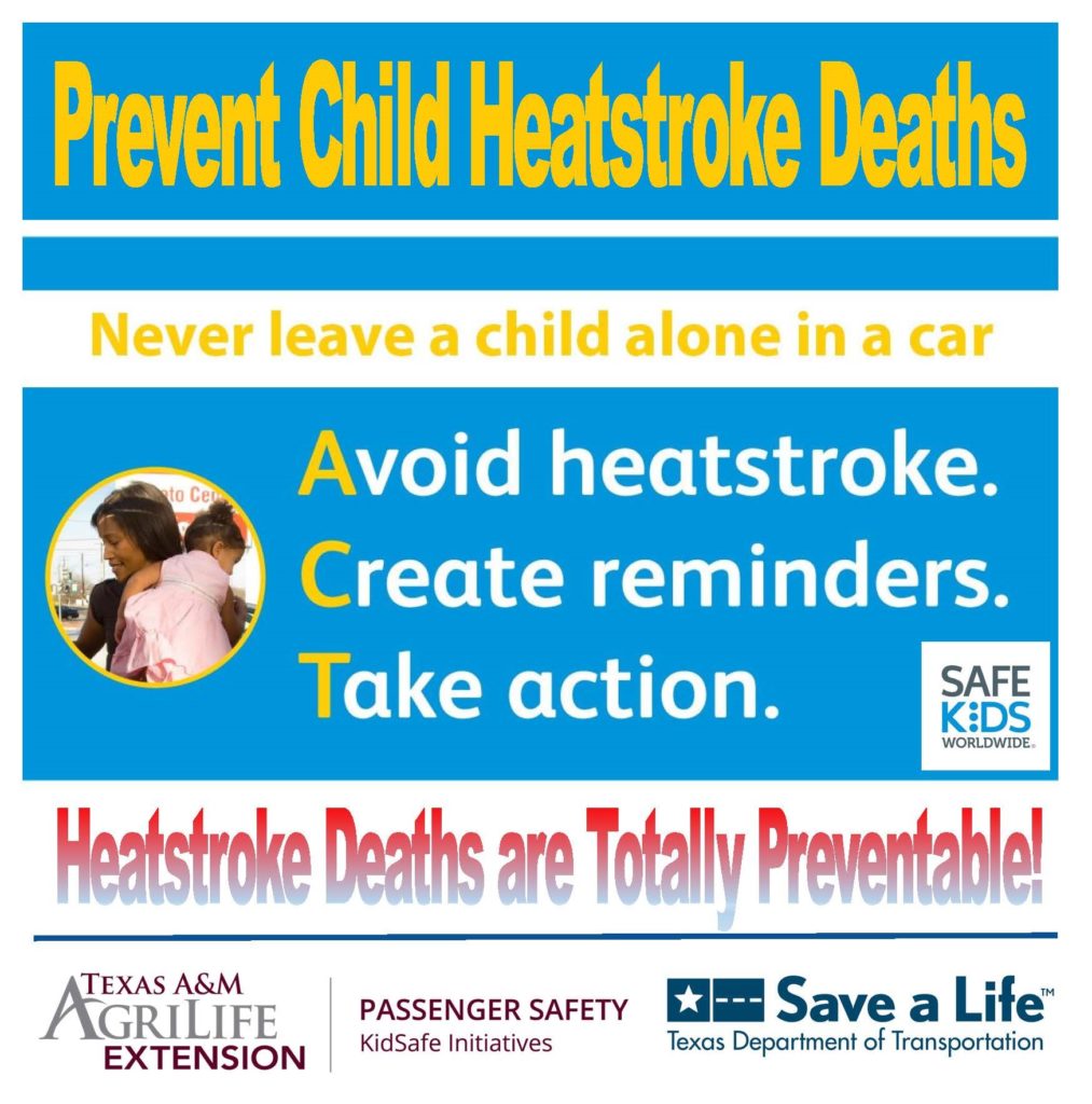 Parents need to take steps to prevent these needless and tragic deaths. To reduce deaths from heatstroke, Safe Kids USA has launched a campaign titled ACT, which stands for: Avoid Heatstroke-related Injury, Create Reminders, and Take Action. The campaign is designed to link together these simple heatstroke prevention steps.