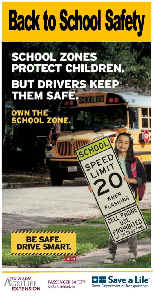 With the pandemic still on everyone’s mind, school has started back up and most children are attending in-person classes.  Extra care needs to be taken by motorists now sharing the roads with school buses, children walking or on bicycles, and even lots of new teen drivers taking their first car trip to school. Drivers need to be vigilant because school children can be very unpredictable. They’re easily distracted and can often run into traffic or out from behind parked cars. Looking out for children, rather than expecting them to look out for vehicles, is the best defense for drivers. Despite less traffic due to the pandemic, according to the Texas Department of Transportation (TxDOT), there were still 400 vehicle crashes in school zones in 2020, resulting in 11 serious injuries. The most common causes for these crashes were entirely preventable: failure to control speed, driver inattention, and failure to yield the right of way at a stop sign or private drive. Whether it is a child just starting kindergarten, or a teen taking that first trip to school in his or her own car, parents can play an important role in keeping their children safe. For young children, make sure they know the rules about school bus safety when it comes to boarding and getting off the bus. If transporting children to school, remember that children under 13 should always ride in the back seat in a car seat (including a booster), or seat belt, depending on whether they fit properly in the seat belt. Teen drivers and their parents should be aware of the Texas Graduated Driver License Law and the restrictions it puts in place, including no cell phone use and no more than one passenger under 21 in the vehicle unless the passenger is related to the driver. And most importantly, always stress buckling up on every trip — even on those short trips to and from school! Leticia Hardy, Texas A&M AgriLife Extension Service agent in Fort Bend County, reminds drivers to follow these safety tips from TxDOT to avoid needless tragedies. Tips for Children Walking or Biking to School