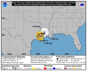 NOTE: This story will be updated as events warrant. By George Slaughter [caption id="attachment_363899" align="alignright" width="300"] The predicted path of Tropical Storm Nicholas at 10 a.m. Monday (Courtesy National Weather Service)[/caption] Mayor Bill Hastings said things in the City of Katy are returning back to normal following the arrival and passage of Hurricane Nicholas early Tuesday morning. “Together we have survived another weather event,” Hastings said in a statement. “We are thankful for minimal impacts from Tropical Storm-Hurricane Nicholas and will be moving forward today with business as usual.” Hastings said the city is blessed to have an extraordinary public works department, police department, fire department, office of emergency management and administration. He said the personnel in those departments stand ready to always protect the community. “Without them, we would not be able to persevere through situations such as Tropical Storm-Hurricane Nicholas,” Hastings said. “We want to thank them for their service and their dedication as well as all employees of the City of Katy who come together and times of crisis.” The public works department is cleaning debris from city streets due to Nicholas. The department is using its street sweeper to perform this task. To better do the work, the department asks the public not to park their cars in the street. Instead, the public is asked to use garages, driveways, or possibly ask neighbors for permission to park in their driveways. The Texas Pride garbage service will not run its routes Tuesday, but will pick up trash as part of its Wednesday routes. The city said all ball fields at Katy city parks are closed until further notice. City crews are assessing and cleaning up debris. Citizens with questions or concerns are invited to contact the public works department at PublicWorksInfo@cityofkaty.com or 281-391-4820.