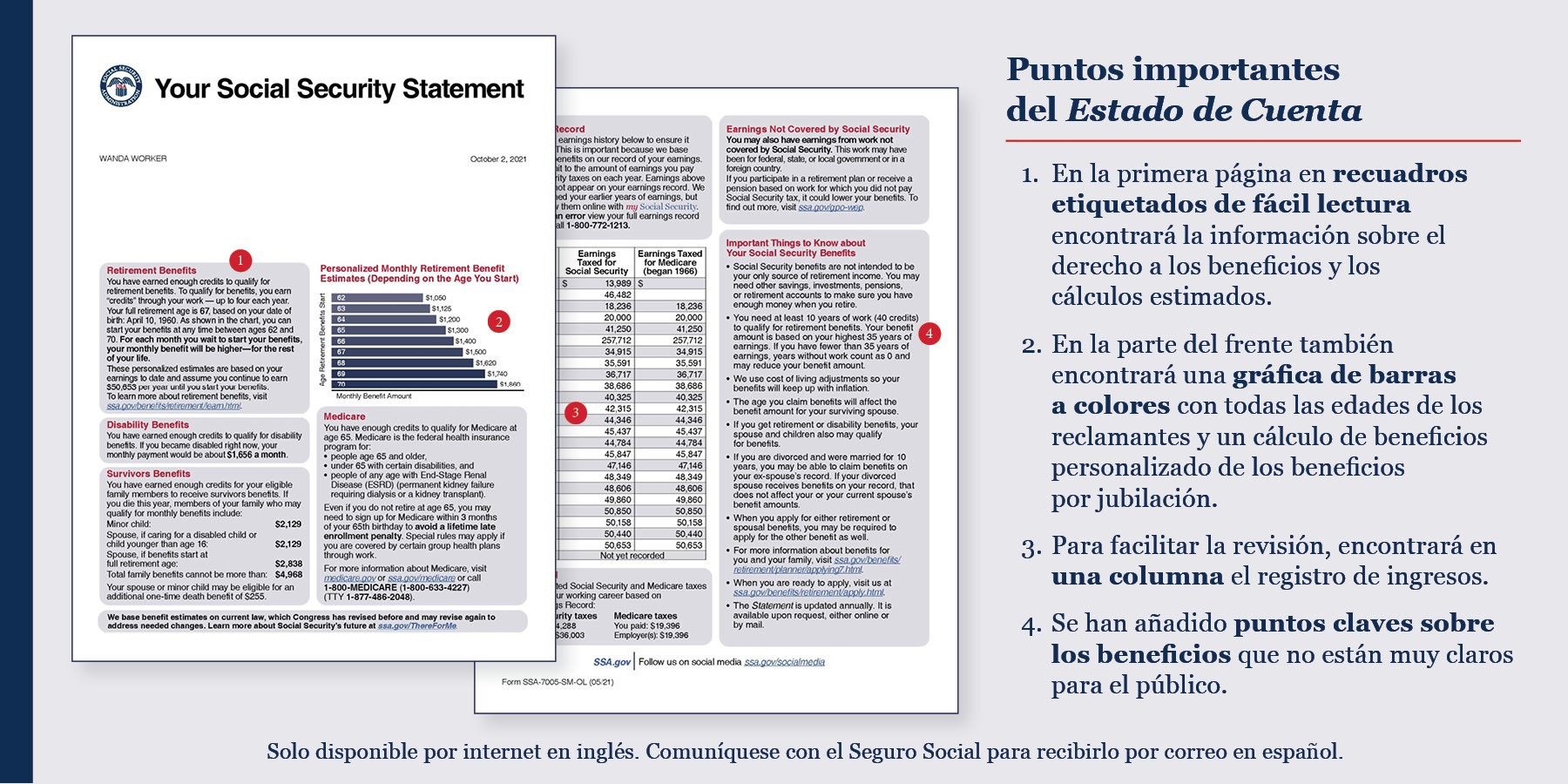 The agency conducted extensive research, review, and testing to make the updated Statement easy to understand. The new Statement is shorter, uses visuals and plain language, and includes fact sheets tailored to a person’s age and earnings history. It also includes important information people have come to expect from the Statement, such as how much a worker and family members could expect to receive in Social Security benefits and a personalized earnings history, in a clear, concise manner. Examples of the new Statement and fact sheets are available at www.socialsecurity.gov/myaccount/statement.html.