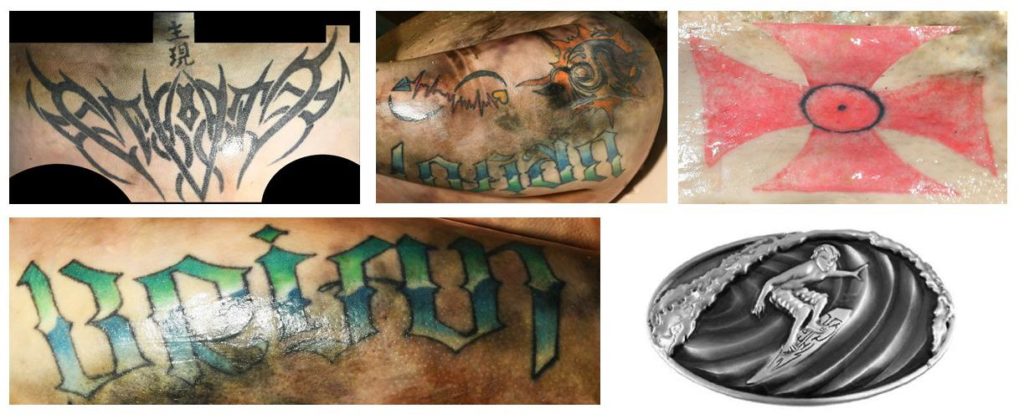 Unknown male found in a wooded area in an advanced state of decomposition. He was wearing a long-sleeved black button down Calvin Klein brand shirt, Arizona Jean Co. brand jeans (size 34x30) with a leather belt and a silver-colored buckle, black Dickies socks, and brown Clarks brand boots. The decedent has several tattoos: left arm (dragon within a sun, an infinity sign arrow, and the name BRIAN), left forearm (red cross with black circle and dot), and back (Asian lettering on the back of his neck and a tribal design on his back). The decedent also has braces on his upper and lower teeth.
