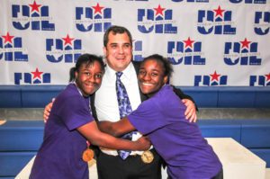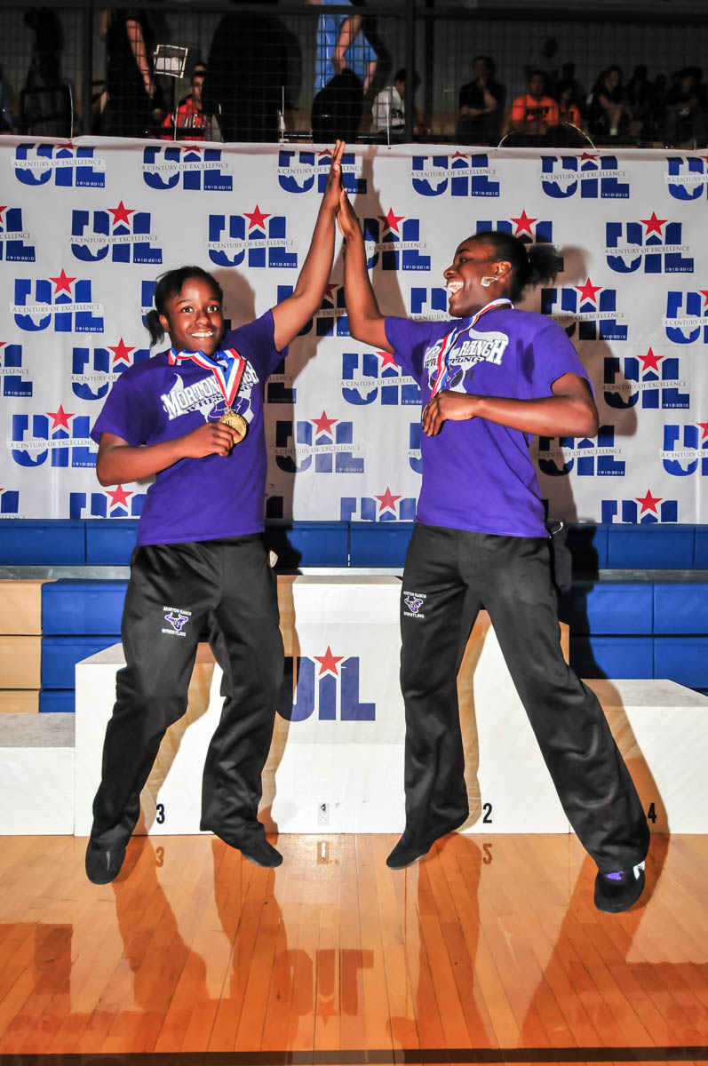 Morton Ranch wrestlers Tarkyia Mensah (left) and Tamyra Stock celebrate with Morton Ranch coach Mark Balser at a 2011 photo at the UIL State Wrestling Championship. Both seniors had just won state championships in wrestling. For Stock, it was her second consecutive title.[/caption]
