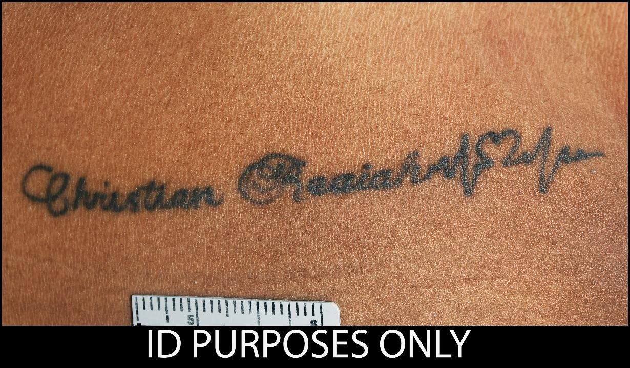 The decedent appears to present as female, has long brown braids and was clothed in a leopard print hair cover, blue sports bra, pink bra, dark blue sweat pants and gray underwear. They have one tattoo (as shown below) on the front, upper left chest that appears to read: “Christian Reaiah” or “Reaiak” with a heartbeat graphic.