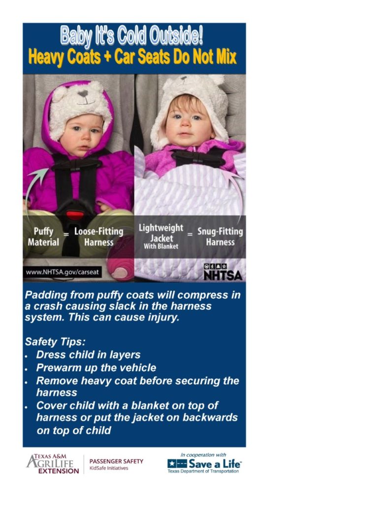 That’s why Texas A&M AgriLife Extension Family and Community Health Educator Leticia Hardy, Fort Bend County reminds all parents and caregivers to secure children properly on every trip including making sure that heavy jackets are not worn when the child is placed in a car seat. To make sure you are using your car seat correctly get a free car seat inspection by searching for a local technician at https://buckleup.tamu.edu .