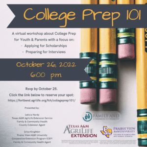 College Prep 101 is a virtual workshop for high school students and parents. This seminar will offer the basics of how to apply for scholarships and interviewing techniques. These step-by-step tips will provide students who have the potential for a great college career but not necessarily the financial backing to attend their top choice school. Whether you plan to obtain an Associate Degree or a Bachelor’s Degree, College Prep 101 will extend the extra boost many students need to plan and realize the future of their dreams. Join us on October 26, 2022 at 6:00 pm. The workshop is FREE but does require registration. To register for the class please go to https://fortbend.agrilife.org/fch/collegeprep101/. The workshop will be led by Family and Community Health Department Agents Leticia Hardy of Texas A&M AgriLife Extension and Erica Knighton of Prairie View A&M University Cooperative Extension Program.