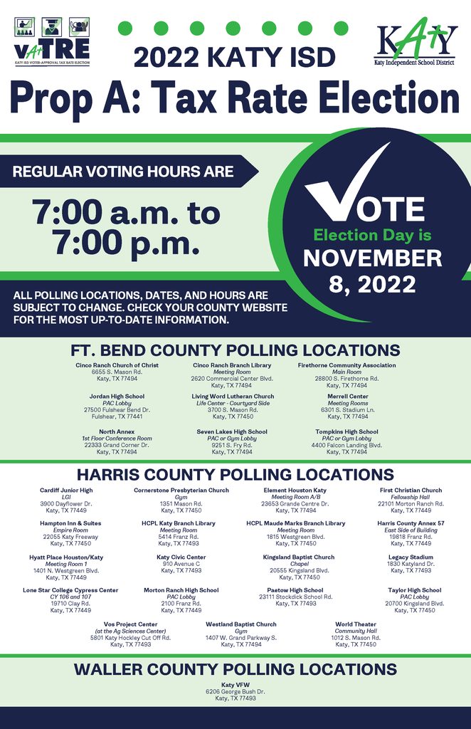 More information about Katy ISD’s Proposition A (Tax Rate Election) can be found on the District’s TRE webpage.