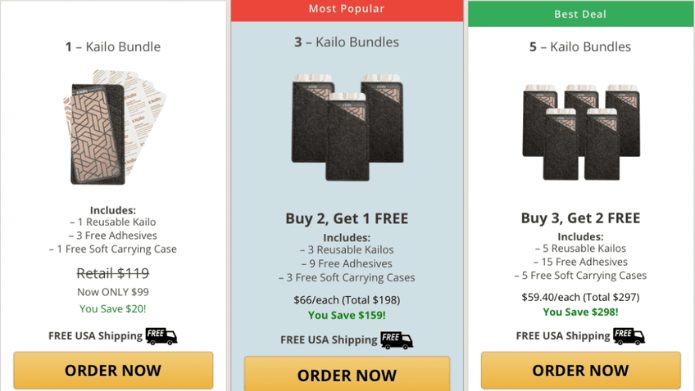 - Kailo Buddy Pack Package – This amazing combo kit contains 3 Kailo pain patches, nine adhesive strips, and three soft cases. The price of this package is around $198. Free U.S. Shipping.