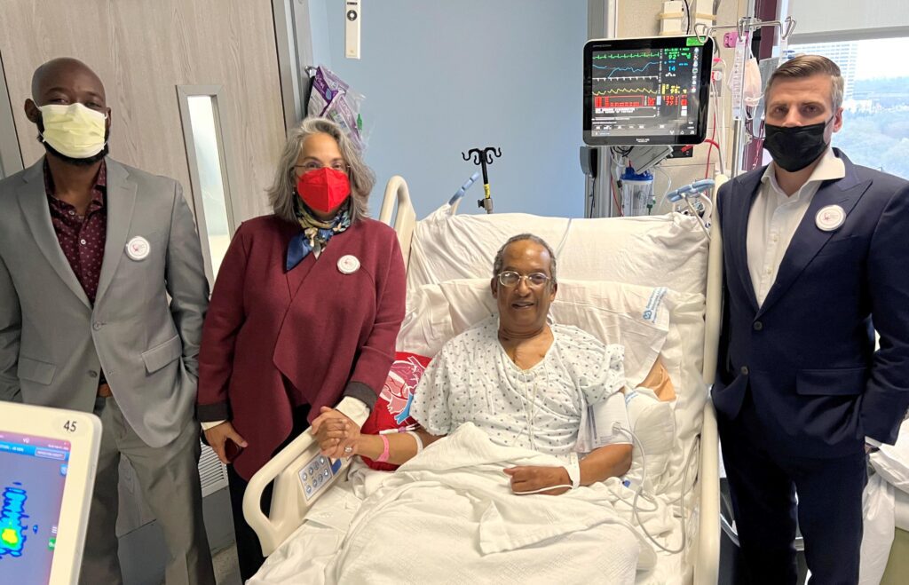 Photo caption: Air Force Veteran John Graves celebrates with his Houston VA care team, (left to right) Dr. Steven Antoine, Dr. Savitri Fedson, and Dr. Alexander Schutz. Courtesy of the Michael E. DeBakey VA Medical Center.[/caption]