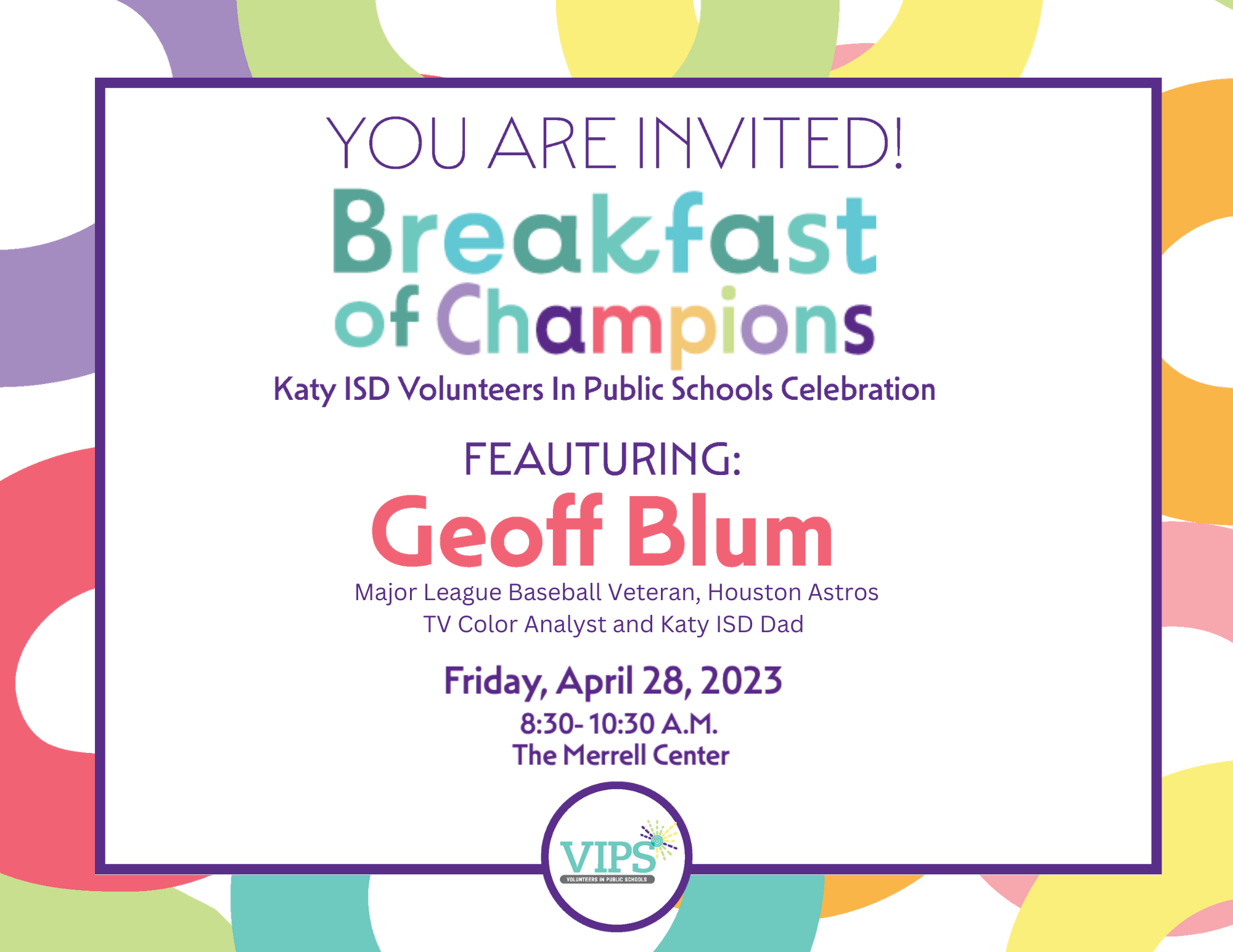 Photo Caption: Katy ISD Partners in Education will celebrate district volunteers on April 28th at the Merrell Center. Katy ISD Volunteers in Public Schools Breakfast April 28th Katy ISD’s Volunteer in Public Schools (VIPS) Celebration Breakfast will be held in the Leonard Merrell Center Arena on Friday, April 28 from 8:30-10:30 a.m. Hosted by Katy ISD Partners in Education and its VIPS Executive Board, the event honors and celebrates the school district volunteers who give the gift of their time and talents to Katy ISD students and teachers. This year will feature Major League Baseball veteran, Houston Astros TV color analyst and Katy ISD Dad, Geoff Blum as well as entertainment from students across the district. All Katy ISD volunteers who have volunteered at a campus this year are invited to attend and should RSVP no later than April 25th by visiting the “Community” page at www.katyisd.org and click “Volunteers in Public Schools (VIPS).”  Doors will open at 8:15 a.m. and carpooling is encouraged. For more information about the event, volunteers should contact their campus VIPS Liaison or tammyrstringer@katyisd.org.