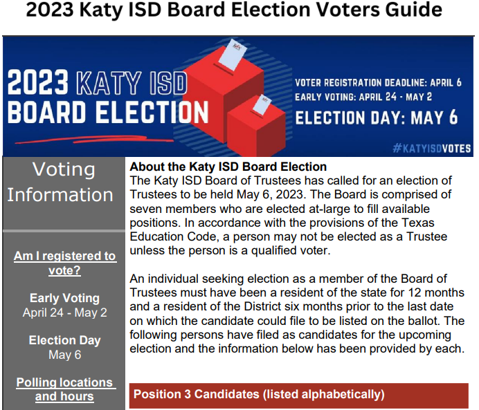 As you get ready to make your way to the polls, take a moment to check out the Katy ISD Voter’s Guide below.