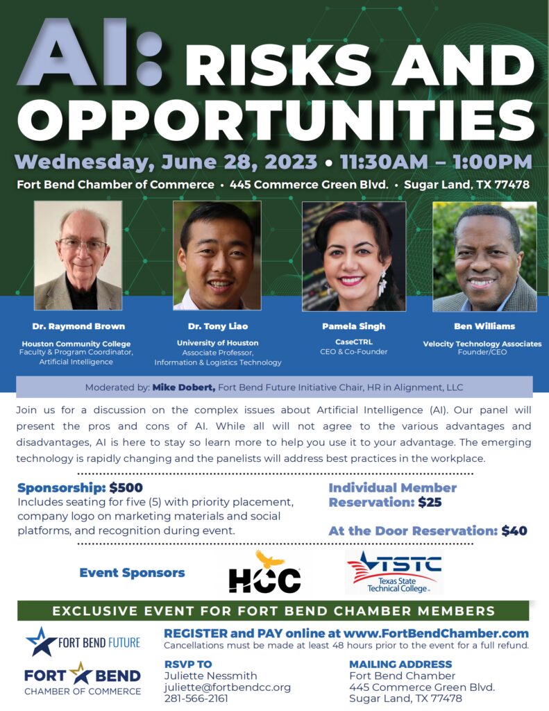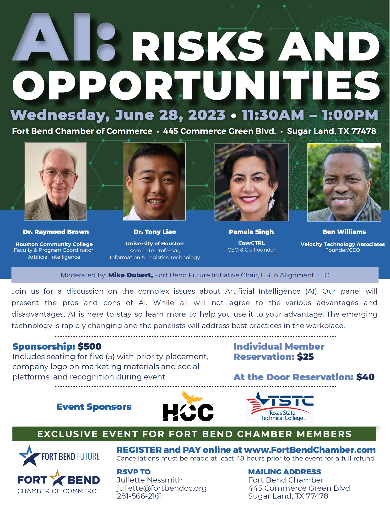 The Fort Bend Chamber of Commerce presents “AI: Risks & Opportunities” with panelists Dr. Raymond Brown with Houston Community College, Dr. Tony Liao with University of Houston, Pamela Singh with CaseCTRL, and Ben Williams with Velocity Technology Associates. Join us for a discussion on the complex issues about Artificial Intelligence (AI) and how it can impact your business. This event will take place at the Fort Bend Chamber office on Wednesday, June 28th from 11:30AM - 1:00PM and is sponsored by Houston Community College and Texas State Technical College. Our speakers will present the pros and cons of AI. While all will not agree to the various advantages and disadvantages, AI is here to stay so learn more to help you use it to your advantage. This emerging technology is rapidly changing, and the panelists will address best practices in the workplace. The discussion will be moderated by Fort Bend Future Chair Mike Dobert, with HR in Alignment and is sponsored by Houston Community College. Registration is open; sponsorship and ticket options are available. For more information, contact Juliette Nessmith at 281.566.2161, juliette@fortbendcc.org or visit www.fortbendchamber.com. Fort Bend Future is a technology advisory council where the business and education communities collaborate to cultivate, attract, and retain a tech-savvy workforce. As the epicenter of growth and development for businesses and communities, Fort Bend is one of the fastest growing counties in the nation, a pro-business region with a population near 900,000 encompassing seventeen cities and villages, each with its own unique flavor and characteristics offering a lifestyle with exceptional amenities. Fort Bend Future is inspired by individual initiative, an entrepreneurial spirit, and the strength of our diversity – all necessary components to make our county a hub of innovation. Centered on the innovative technology sectors that exist in Fort Bend County, this initiative is primed to soar into the future! This unified effort will create a destination for technology and innovation with a strong focus on a prosperous future for Fort Bend.