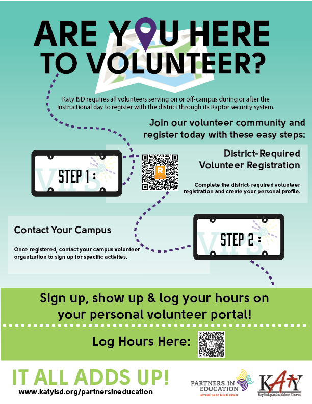 For the second year, Katy ISD will require all volunteers serving on or off-campus during or after the instructional day to register with the district through its Raptor security system. This includes all KEYS mentors, business & community partners, booster club members - anyone who gives their time to Katy ISD campuses. Once registered and approved, individual volunteers can submit and track hours via their volunteer profile for every Katy ISD campus at which they volunteer. Following approval, volunteers can begin service to their campus by completing the volunteer recruitment form provided by the campus or contact their campus volunteer coordinator.