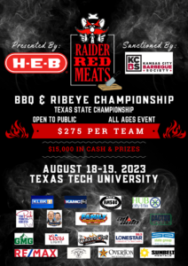 2023 Raider Red Meats Barbeque and Ribeye Championship Cook-Off hosted by Texas Tech University in collaboration with H-E-B and the Kansas City Barbeque Society (KCBS).