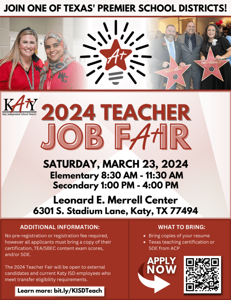KATY, TX [March 8, 2024] – Katy Independent School District (Katy ISD) extends a warm invitation to certified teachers seeking an opportunity to join the top-ranked school district in the Greater Houston area. As we gear up for the 2024-2025 academic year, Katy ISD is excited to announce its upcoming Certified Teacher Job Fair scheduled for Saturday, March 23, 2024. "In Katy ISD, we pride ourselves on being a premier school district, where our dedicated and passionate educators consistently provide unmatched learning experiences to over 95,000 students," stated Brian Schuss, Chief Human Resources Officer. "As a result of our rapid growth, we are excited to announce the opening of Nelson Junior High and Freeman High School next year, which will further enhance our educational offerings," Schuss added, emphasizing the increased hiring needs across the district. This event will provide a platform for prospective candidates to directly engage with administrators from both elementary and secondary campuses. Attendees will have the unique opportunity to network with principals and engage in on-the-spot interviews. Katy ISD was recognized by Forbes as one of America's Best Employers in Texas. This prestigious acknowledgment further solidifies Katy ISD's commitment to providing an exceptional work environment for educators. No pre-registration or fees are requisite for attendance; however, participants are kindly requested to show proof of certification, TEA/SBEC content exam scores, and/or Statement of Eligibility (SOE). It is recommended that candidates proactively complete an application on the Katy ISD website prior to the event and come prepared with an ample supply of resumes to distribute at the fair. For more information, visit the Katy ISD Human Resources Job Fair webpage What:           Katy ISD 2024 Certified Teacher Job Fair Where:         Leonard E. Merrell Center 6301 South Stadium Lane Katy, TX  77494 When:          Saturday, March 23, 2024 8:30 – 11:30 a.m. – Elementary Job Fair 1:00 – 4:00 p.m. – Secondary Job Fair