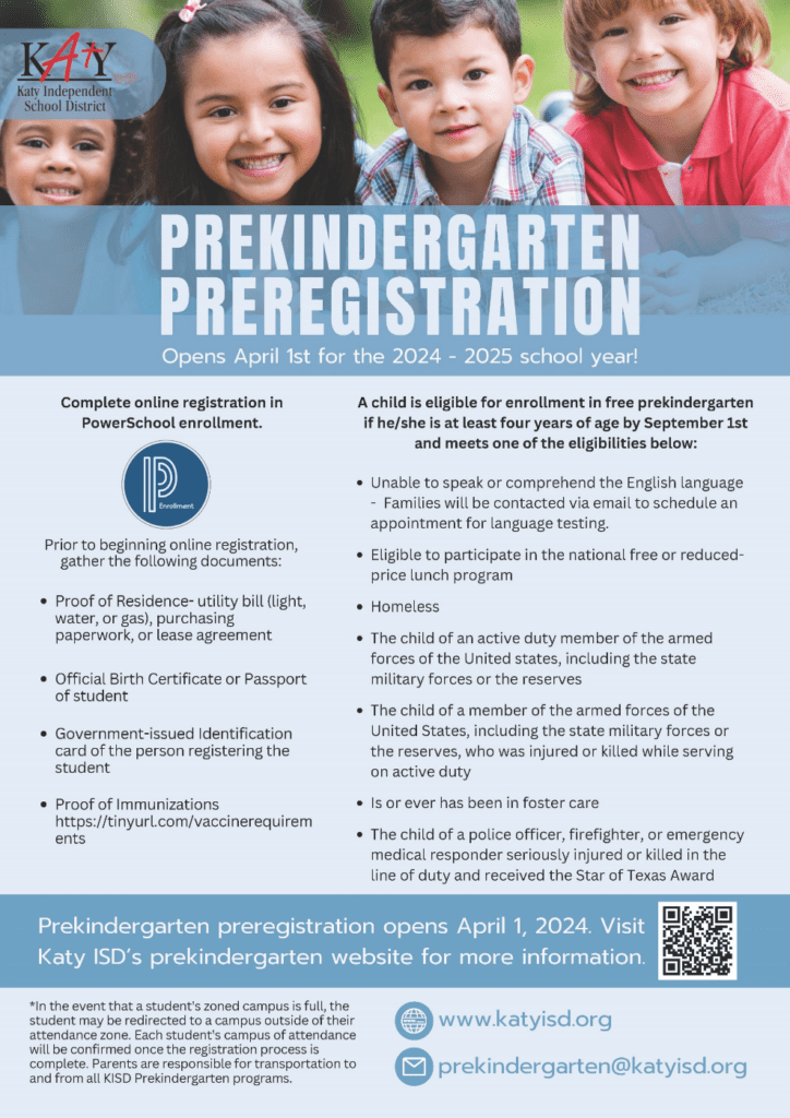 KATY [March 19, 2024] – The Katy Independent School District Prekindergarten program preregistration for the 2024-2025 school year opens April 1, 2024, for children who qualify and are zoned to the district. Parents of eligible students for the program are encouraged to complete the online preregistration process through Katy ISD’s PowerSchool Registration website, which will become available beginning April 1, 2024.