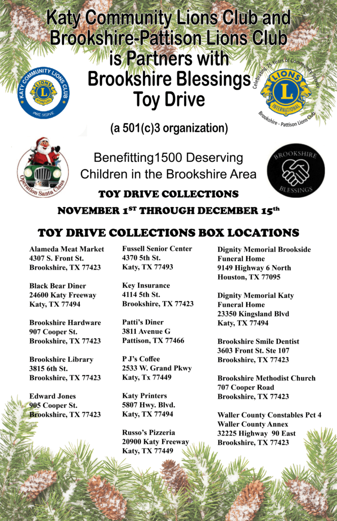Katy Community Lions Club and Brookshire-Pattison Lions Club is Partners with Brookshire Blessings Toy Drive