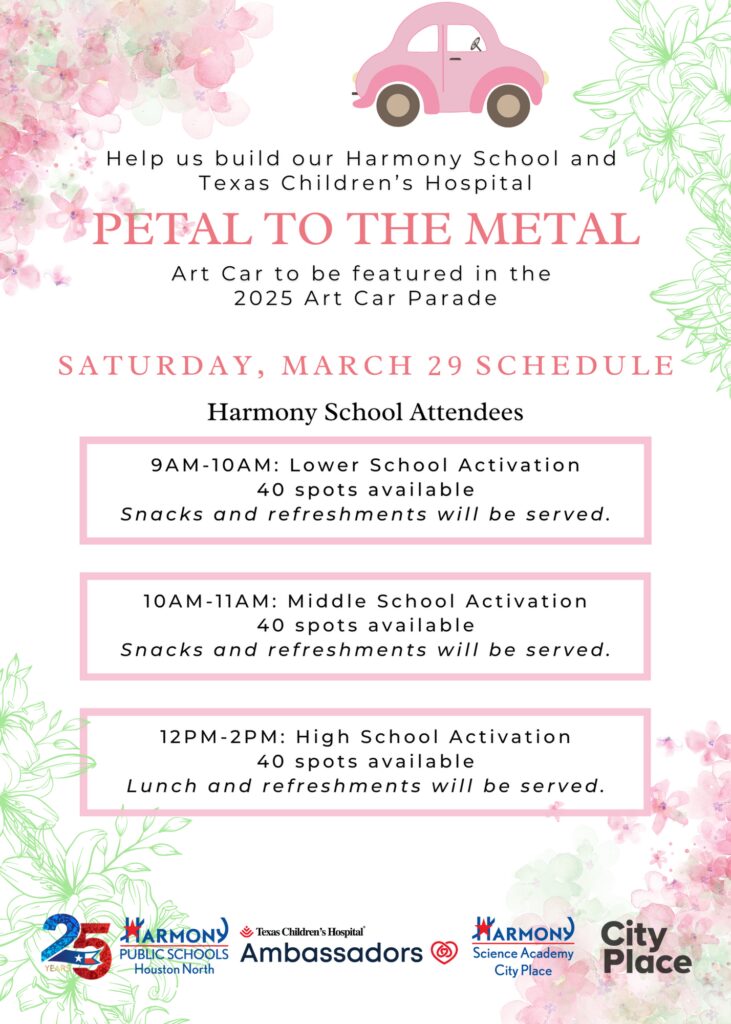 Please join Harmony Public Schools Houston North, Texas Childrens Hospital and City Place for our Art Car Build Day.