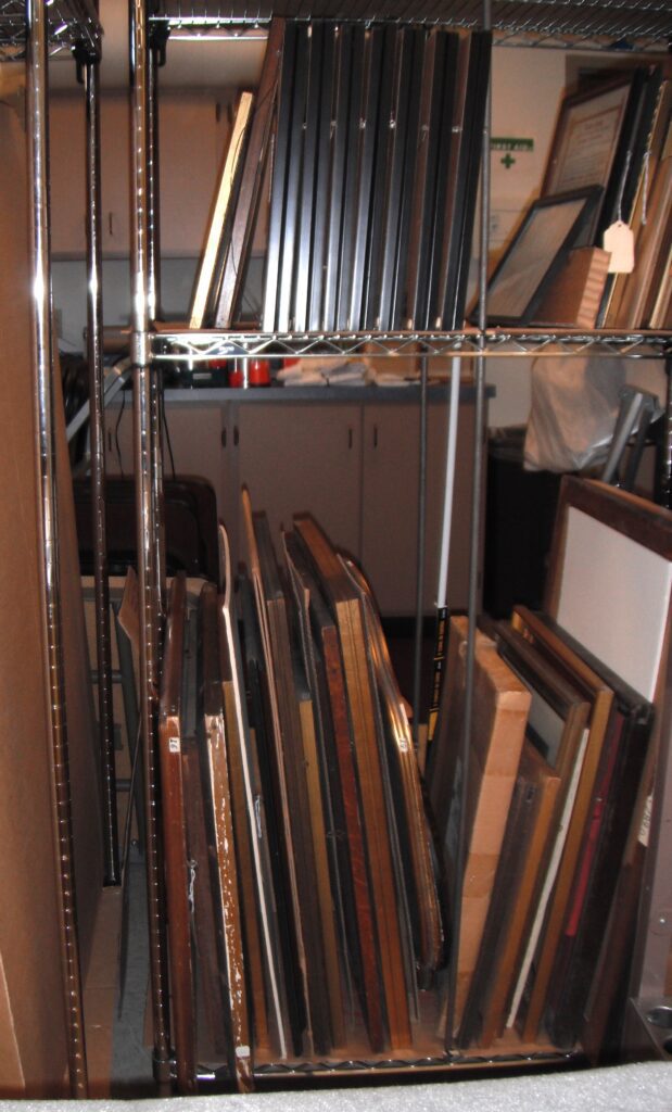 Large paintings should be stored off the floor, preferably hanging up on secure hooks. If there is no room for such a storage solution, then store large paintings standing upright. While it may seem convenient, never lay paintings flat nor should they be stored face up under a bed or leaning against a sofa or other piece of furniture. Smaller paintings may be stored upright back-to-back or face-to-face on separated shelves. Use acid free foam core dividers to prevent the wire on the back of one painting from scratching the front of another painting. There are specific techniques to protecting art, a good rule of thumb is to handle with care, display works of art away from direct sunlight, and store works in areas where temperature and humidity fluctuations are minimal.