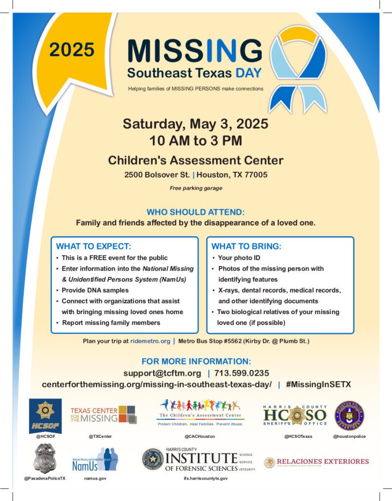 MISSING IN Southeast Texas DAY (MISETD) will be held Saturday, May 3rd, from 10 AM to 3 PM at The Children’s Assessment Center – Training Center located at 2500 Bolsover St, Houston, TX 77005.