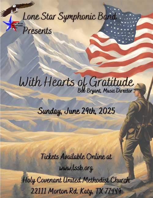 The Lone Star Symphonic Band will conclude its 32nd Concert Season with their annual Patriotic concert on June 29th, 2025. The performance will take place at Holy Covenant United Methodist Church, located at 22111 Morton Rd., Katy, Texas, 77449. Tickets for the concert are available for $11 each online at https://app.arts-people.com/index.php?show=243657. The Band is excited to announce the formation of a non-auditioned community chorus to perform with the band during the second half of our upcoming patriotic concert. We invite individuals from the Katy and Houston areas to participate in this unique opportunity to be part of a beloved annual event celebrating our country and patriotism in the Katy community. All voice types, soprano, alto, tenor, and bass, are welcome to join. As with most groups, we always could use more tenor and bass voices. Those interested in performing with the band in the community chorus are encouraged to contact the Band President, Beverly Buis, at BeverlyBuis@lssband.org for additional information and to join the rehearsal email list.  Rehearsals will take place on Sunday evenings from 6:00 to 8:00 p.m. at Holy Covenant United Methodist Church on the following dates: June 1st, 8th, 15th, and 22nd. The Lone Star Symphonic Band is a non-profit, volunteer-driven organization committed to delivering performances of artistic excellence to the Houston metropolitan area. Founded in 1993 as the West Houston Concert Band, the ensemble is composed of musicians from diverse backgrounds and fosters the belief that music is a lifelong pursuit, extending far beyond high school and college years. In the summer of 2016, the Band began rehearsing and performing at Holy Covenant United Methodist Church in Katy, Texas. In December 2012, the Lone Star Symphonic Band was honored with the Sudler Silver Scroll, North America's most prestigious award for Community Concert Bands. Presented by the John Philip Sousa Foundation (www.sousafoundation.net), this distinguished award recognizes community bands that have maintained high standards of excellence in concert performances over an extended period and have made significant contributions to the cultural and musical landscape of their communities.  The Band is currently under the direction of Mr. Bob Bryant.