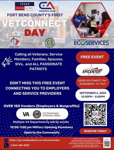 This event is designed to link the military-connected community with employers and essential service providers, creating pathways to employment and support. More than 300,000 Veterans live in and around Houston, with Texas being one of the largest populations of Veterans in the country.