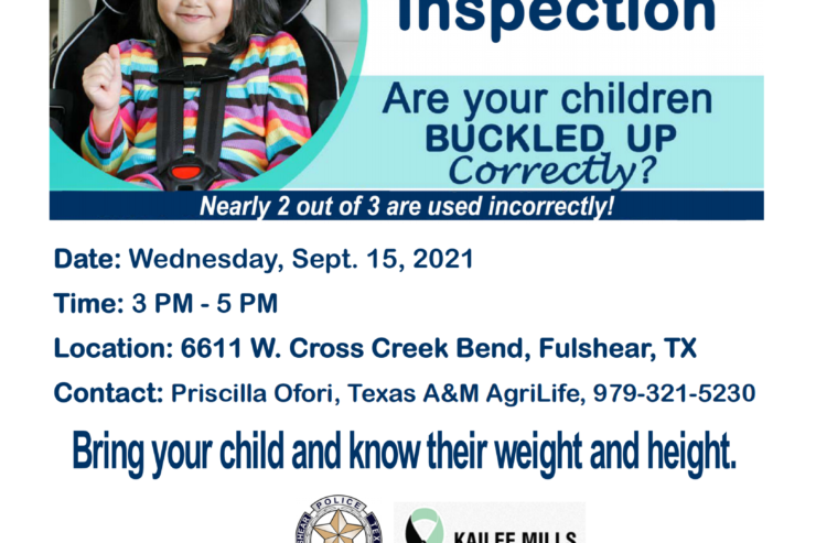 Are your children BUCKLED UP Correctly? Nearly 2 out of 3 are used incorrectly! Date: Wednesday, Sept. 15, 2021 Time: 3 PM – 5 PM Location: 6611 W. Cross Creek Bend, Fulshear, TX Contact: Priscilla Ofori, Texas A&M AgriLife, 979-321-5230