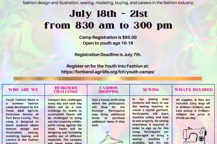 The Texas A&M AgriLife Extension Service will be hosting the Youth Fashion Week Camp on July 18th to July 21st. The camp will be from 8:30 am to 3:00 pm each day. Join us as we venture on a four-day […]